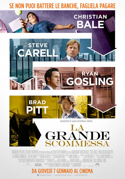 (2015) R: Adam McKay A: Christian Bale, Steve Carell, Ryan Gosling, Brad Pitt. Dal libro di Michael Lewis, storia di un gruppo di investitori che intuì in anticipo lo scoppio della crisi finanziaria esplosa negli USA alla fine del 2006. Acuto, sardonico e divertente, fornisce un’attenta disamina degli eventi facendo affidamento su delle esibizioni perfettamente all’altezza del suo cast. 1 Oscar, per la miglior sceneggiatura non originale.