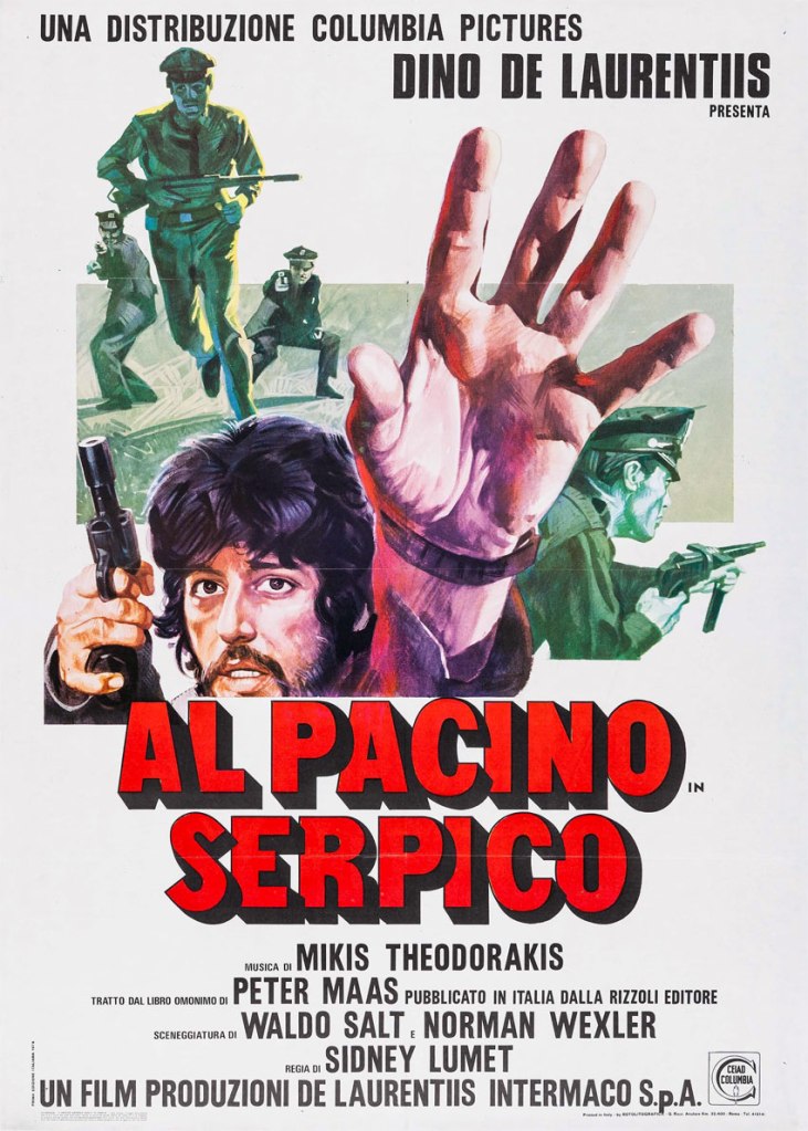 (1973) R: Sidney Lumet A: Al Pacino, John Randolph, Jack Kehoe. La storia vera di un onesto poliziotto di New York che si oppose alla corruzione nel suo reparto. Ripreso con discrezione quasi documentaristica da Lumet, un grande Pacino, doppiato da un altrettanto grande Ferruccio Amendola.