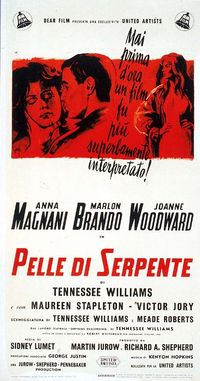 (1960) R: Sidney Lumet A: Marlon Brando, Joanne Woodward, Anna Magnani, Maureen Stapleton. Brando musicista vagabondo arriva in città; col suo fascino porterà scompiglio. Da un’opera teatrale di Tennessee Williams, un film che pur evolvendosi irreparabilmente su sé stesso, grazie alla sola magnetica presenza di due autentiche “stelle” (Brando/Magnani) passa inevitabilmente da melodramma di fascino.